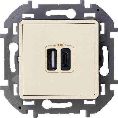Зарядное устройство Inspiria для скрытого монтажа , тип А-тип С, цвет "Слоновая кость". Напряжение ~240В/=5В, максимальный зарядный ток 3000 мА. Применяется для непосредственной зарядки одного или двух мобильных устройств.