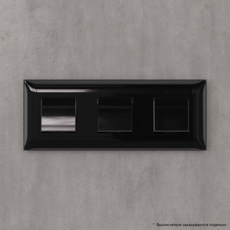 Рамка имеет 3 места под электроустановочные изделия (максимальная вместимость – 6 модулей) и может размещаться как горизонтально, так и вертикально. Габаритные размеры: 235х90 мм. Материал – термопласт.