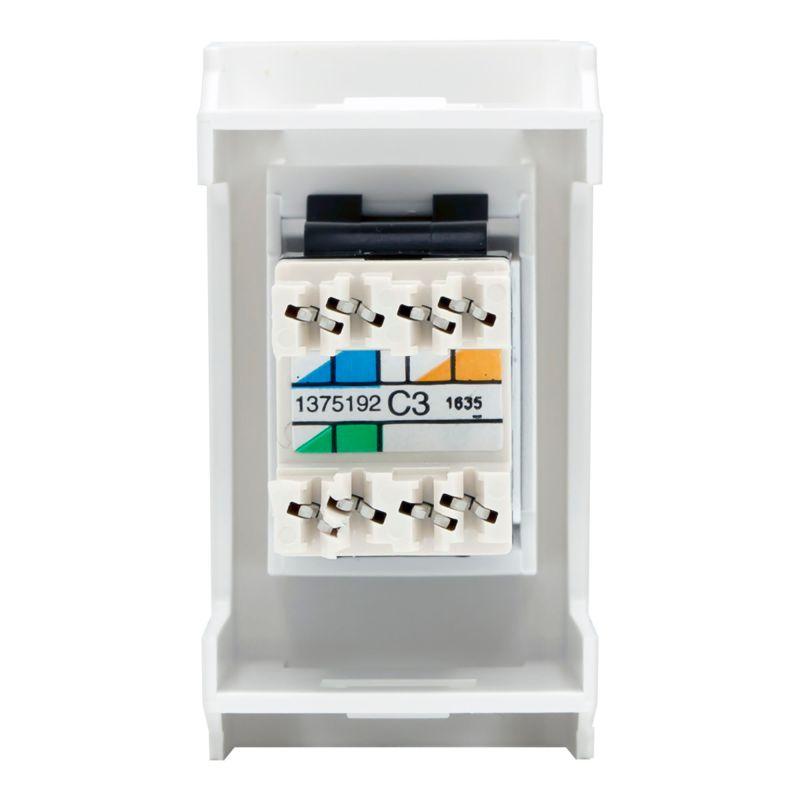 Телефонная розетка. Назначение: подсоединение телефонного кабеля. Характеристики: 6Р6С; комплектуются 1-модульным гнездом; все гнезда производства АМР имеют хвостовик для ограничения перегиба и натяжения кабеля; для заделки контактов в розетки АМР использовать инструмент типа 110. RJ-12. Установочный размер: 45х25. Кол-во модулей: 1. Цвет: белый. Цвет Keystone: белый.