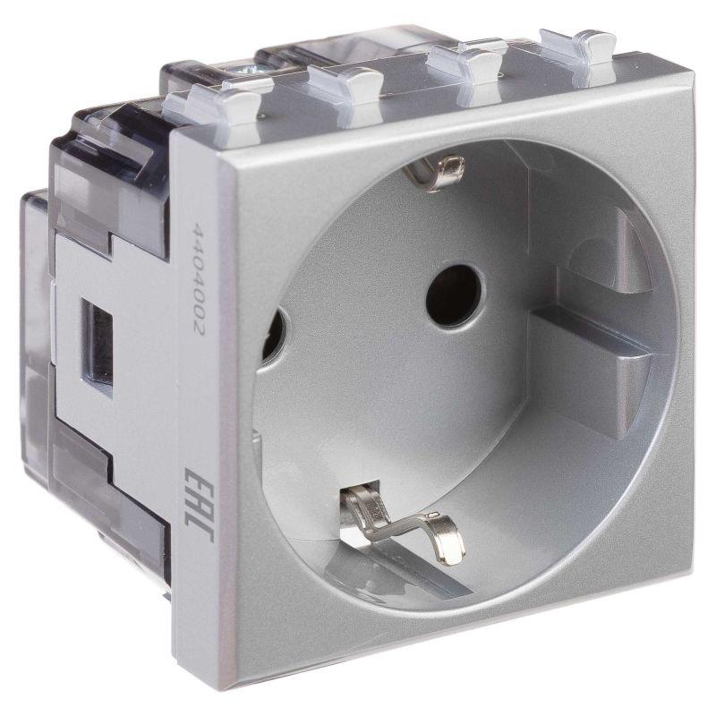 Розетка электрическая с заземлением, со шторками и возможностью установки подсветки, модульная. Предназначена для монтажа в системы "In-liner Front" и "In-liner Aero" при помощи рамок-суппортов и каркасов "Avanti" (код 4400912 и т.д.); назначенпие - подключение оргтехники, бытовых приборов и т. д. Характеристики: диаметр отверстий для ввода кабелей – 3 мм (по 2 отверстия на одну клемму); винтовые зажимы; защитные шторки; шаблон для зачистки кабеля – 11 мм; номинальный ток – 16 A; номинальное напряжение – 230 В; фиксация в подрозеточные коробки глубиной не менее 45 мм при помощи каркаса с лапками (код 4400802) и саморезов. 2 модуля. Цвет: "Закаленная сталь".