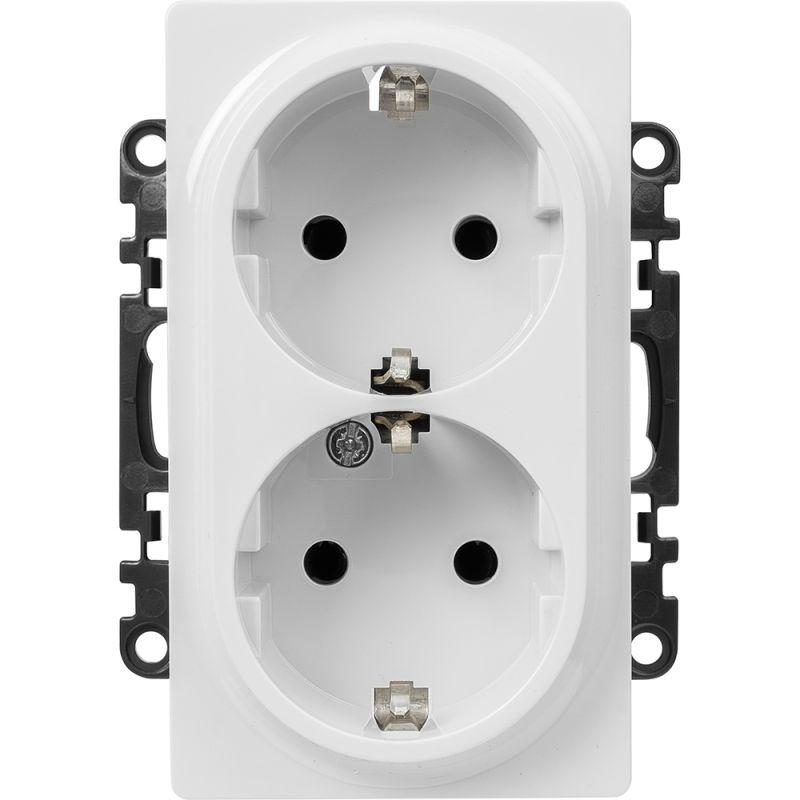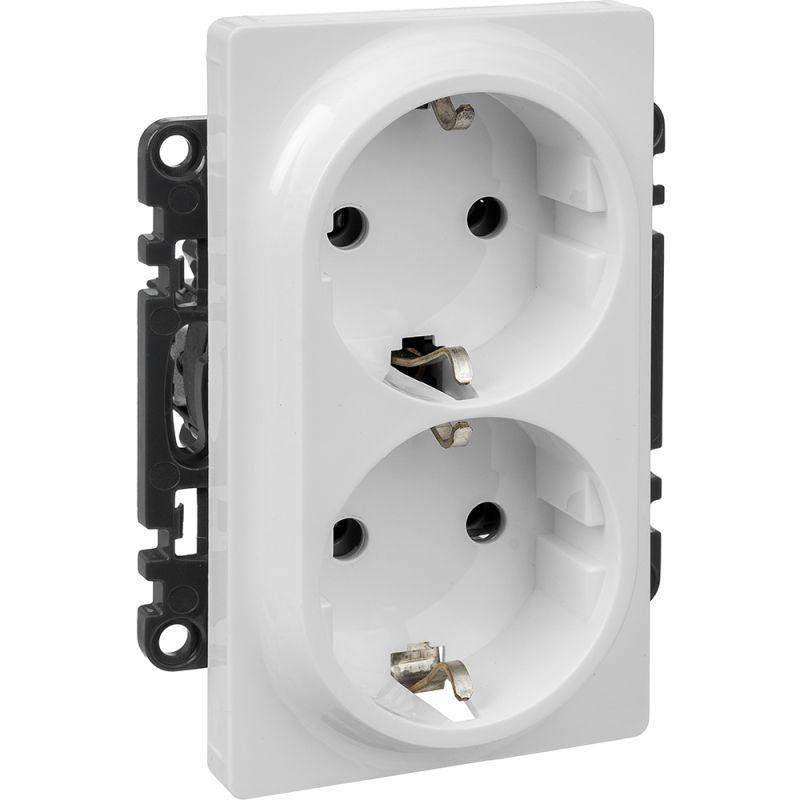 Представляет собой двухместный модуль розетки, 146 х 71 мм, с защитным контактом стандарта SCHUKO. Изготовлен из пластика, с необработанной поверхностью, белого цвета. Монтируется под штукатурку.