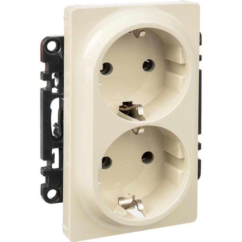 Представляет собой двухместный модуль розетки, 146 х 71 мм, с защитным контактом стандарта SCHUKO. Изготовлен из пластика, с необработанной поверхностью, цвета слоновой кости. Монтируется под штукатурку.