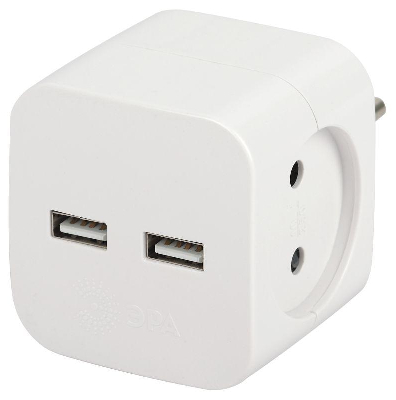 Тройник (адаптер) ЭРА с 2-мя розетками и 2-мя USB гнездами для зарядки портативных устройств. Идеален для зарядки мобильных телефонов и планшетов. Особенно актуален, когда в помещении мало источников подключения - можно из одной розетки сделать две и при этом ещё заряжать 2 устройства одновременно через USB.Максимальная мощность USB разъемов: 2400 мА.