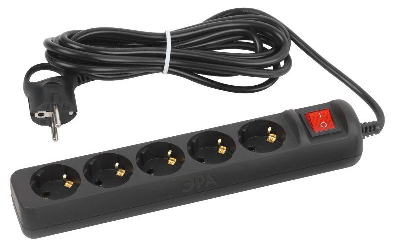 Удлинитель электрический Эра UX-5es-5m-B с заземлением, с выключателем, черный, 5розеток.Провод ПВС, 3x0,75мм2, 5м. Рассчитан на максимальную мощность 10А/2200 Вт. Удлинитель Эра станет Вашим надежным помощником, если Ваши любимые электроприборы находятся далеко от розеток. Провод в удлинителях Эра сделан из 100% меди, что делает его абсолютно пожаробезопасным. Корпус выполнен из ударопрочного и негорючего пластика (полипропилен). Вилка обеспечена кольцом для удобного извлечения ее из розетки. Модель удлинителя на 10А позволяет подключить бытовые приборы общей нагрузкой до 2200Вт. Дизайн удлинителя разработан в России командой Эра Style.