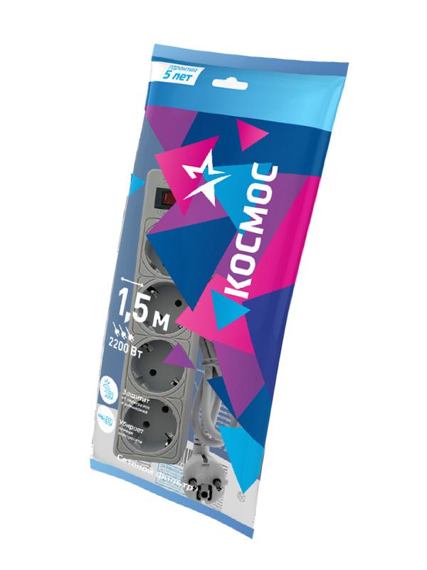 Удлинитель с сетевым фильтром 4х1.5м с заземл. 10А IP20 2.2кВт 3х0.75 с предохранителем с выкл. с индикатором сети КОСМОС FKsm1.5m-4g(G)