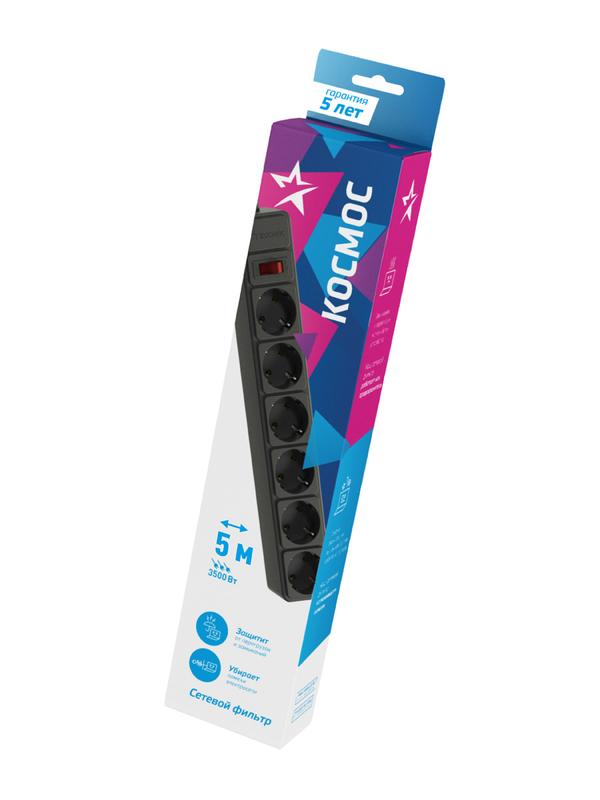 Удлинитель с сетевым фильтром 6х5м с заземл. 16А IP20 3.5кВт 3х1 с предохранителем с выкл. с индикатором сети черн. КОСМОС FKsm5m-6g(B)16A