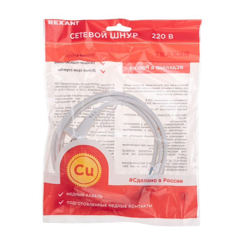 Шнур электрический с прямой вилкой 10А 2200Вт ПВС 2х0.75кв.мм 5м бел. Rexant 11-1300