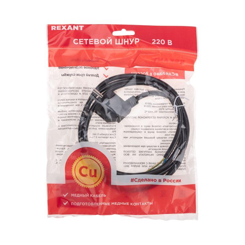 Шнур электрический с угловой вилкой 10А 2500Вт ПВС 3х1.0кв.мм 1.5м черн. Rexant 11-1318