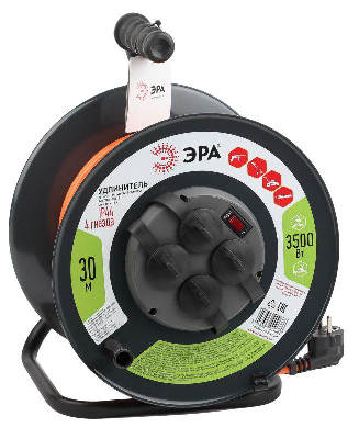 Удлинитель силовой на металлической катушке ЭРА RMx-4es-3x1.5-30m-IP44 с заземлением, с выключателем, ПВС 3x1,5м2, 4 розетки, 30м, степень защиты IP44. Мощность 16А/3500Вт. Используется для работы на строительных площадках или дачных участках. Удобен при работе с приборами находящимися удаленно от стационарной розетки. Например, газонокосилки, электрические, пилы, триммеры или электродрели. Провод в удлинителях Эра сделан из 100% меди, что делает его абсолютно пожаробезопасным. Рама удлинителя сделана из высокопрочной стали.