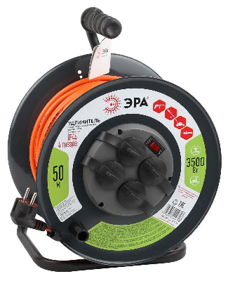 Удлинитель силовой на металлической катушке ЭРА RMx-4es-3x1.5-50m-IP44 с заземлением, с выключателем, ПВС 3x1,5м2, 4 розетки, 50м, степень защиты IP44. Мощность 16А/3500Вт. Используется для работы на строительных площадках или дачных участках. Удобен при работе с приборами находящимися удаленно от стационарной розетки,. Например, газонокосилки, электрические, пилы, триммеры или электродрели. Провод в удлинителях Эра сделан из 100% меди, что делает его абсолютно пожаробезопасным. Рама удлинителя сделана из высокопрочной стали.