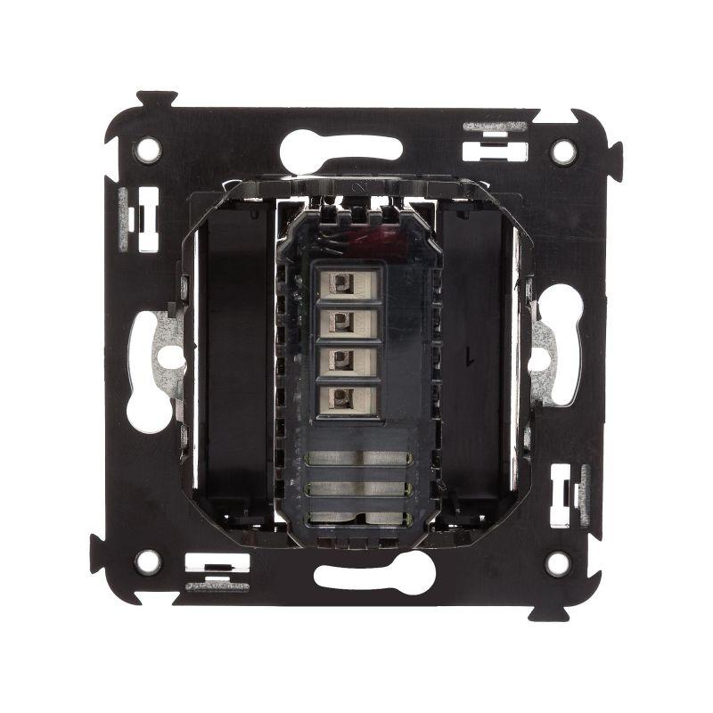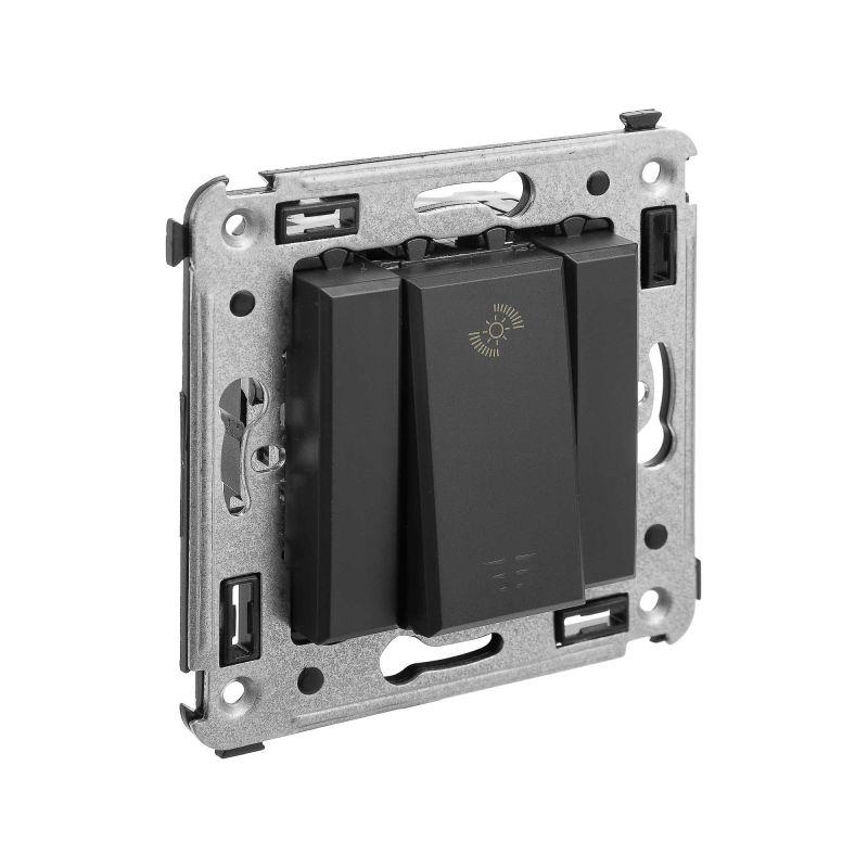 Диммер кнопочный в стену для LED ламп. Предназначен для монтажа в подрозеточные коробки глубиной не менее 45 мм (код 59301). Используется для управления освещением помещения. Регулирование 3–120 Вт для LED ламп; регулирование 3–220 Вт для ламп накаливания и галогенных ламп; диммирование по переднему и заднему фронту; выбор режима включения освещения (плавный пуск). Диаметр отверстий для ввода кабелей – 3 мм; винтовые зажимы. Фиксация производится в подрозеточную коробку при помощи саморезов; шаблон для зачистки кабеля – 11 мм. 2 модуля. Цвет: "Черный матовый".
