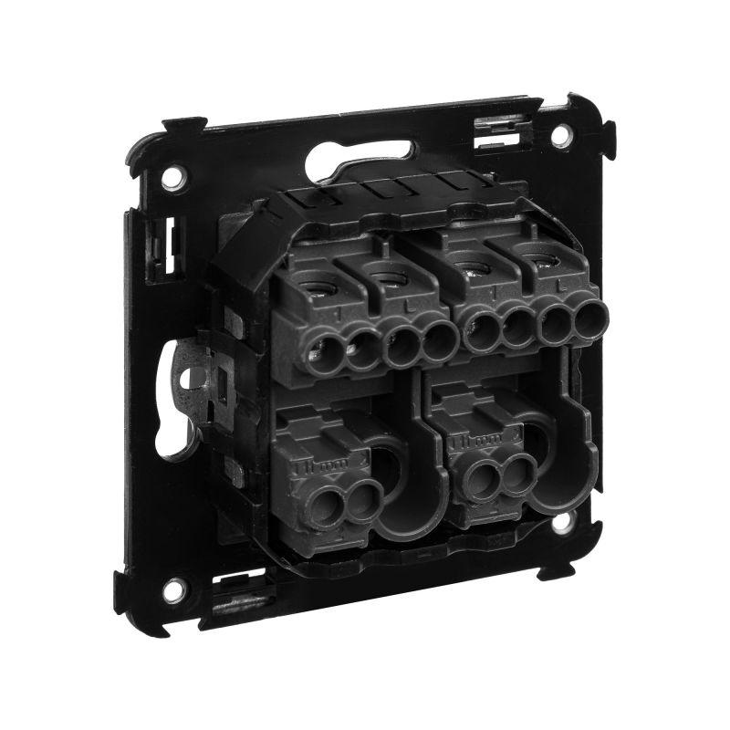 Кнопка двухклавишная. Назначение: для монтажа в подрозеточные коробки глубиной не менее 45 мм (код 59301). Используется для кратковременного включения источника питания. Характеристики: 2 модуля, диаметр отверстий для ввода кабелей – 3 мм (по 2 отверстия на одну клемму); винтовые зажимы; шаблон для зачистки кабеля – 11 мм; номинальный ток – 10 A; номинальное напряжение – 230 В. Фиксация производится в подрозеточные коробки при помощи каркаса с лапками (код 4400802) и саморезов. Цвет: "Черный матовый".