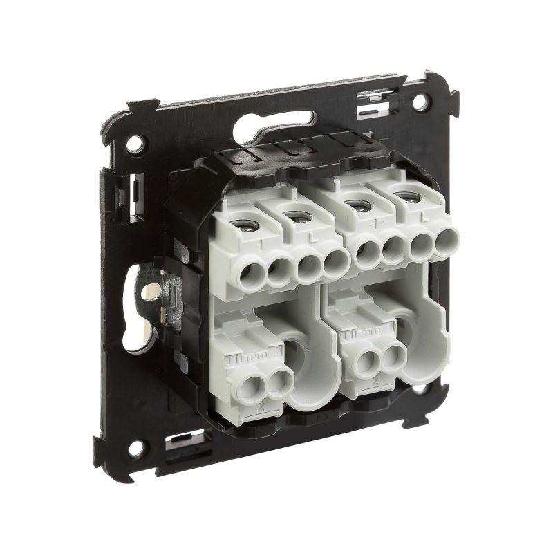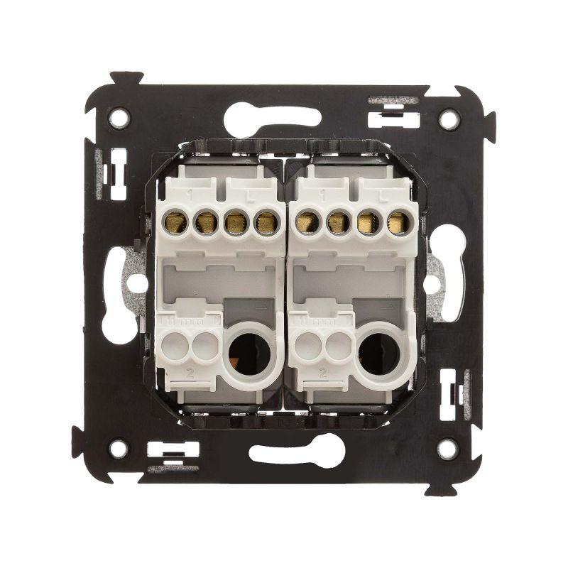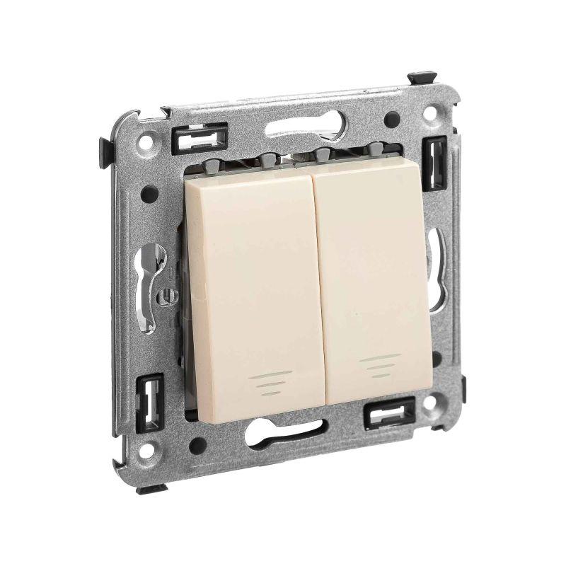 Кнопка двухклавишная. Назначение: для монтажа в подрозеточные коробки глубиной не менее 45 мм (код 59301). Используется в качестве кратковременного включения источника питания энергией. Характеристики: 2 модуля, диаметр отверстий для ввода кабелей – 3 мм (по 2 отверстия на одну клемму); винтовые зажимы; шаблон для зачистки кабеля – 11 мм; номинальный ток – 10 A; номинальное напряжение – 230 В; фиксация в подрозеточные коробки при помощи каркаса с лапками (код 4400802) и саморезов. Цвет: "Закаленная сталь".