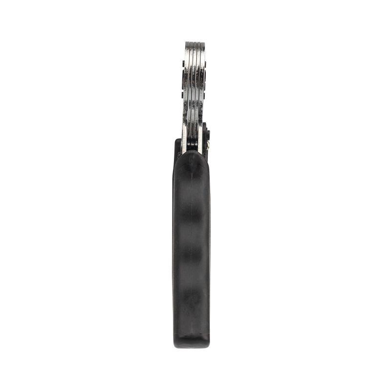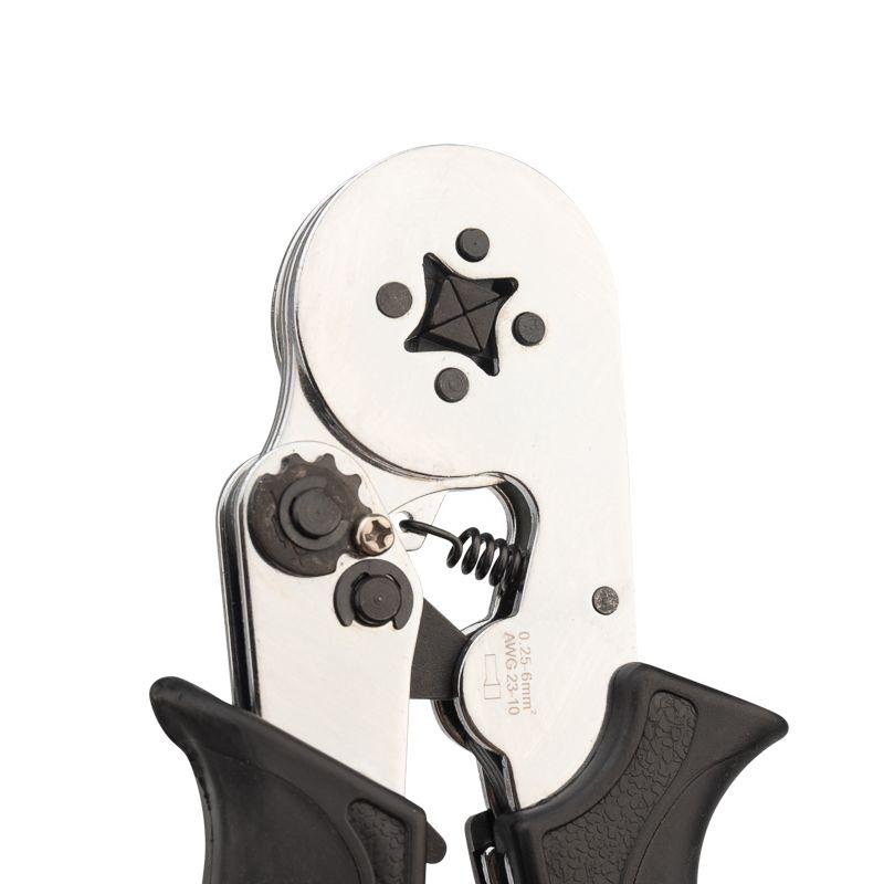 Четырехсегментная саморегулирующая матрица с системой поворотных кулачков диафрагменного типа. Клещи имеют настройку давления опрессовки и принудительно размыкающуюся блокировку, которая не позволяет разойтись рукояткам до полной опрессовки, т.е. контролирует качество контактного соединения. Храповой механизм, гарантирует полный цикл качественной опрессовки. Корпус выполнен из закаленной инструментальной стали (сплав хрома и ванадия) и имеет закругленные линии корпуса для удобства и безопасного использования. Рукоятки выполнены из плотного синтетического покрытия с резиновыми вставками, благодаря которому руки не будут скользить.