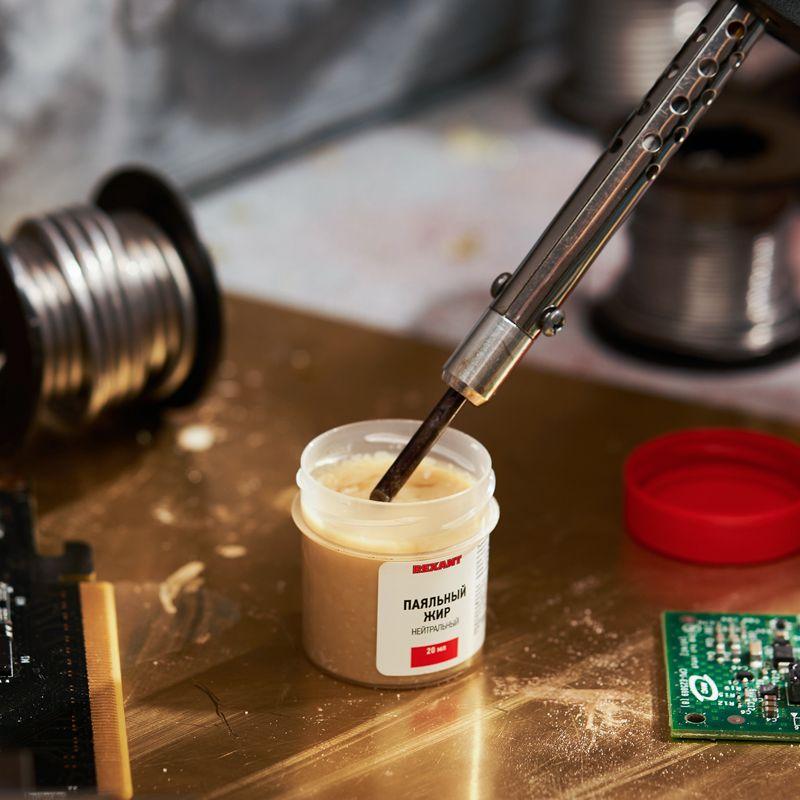 Паяльный жир нейтральный 20 г REXANT предназначен для удаления оксидов с поверхности под пайку, улучшения растекания жидкого припоя при пайке радио и электротехнических устройств. Главным образом, жир хорошо держится на различных металлических контактах, тем самым в отличие от жидкого флюса, есть возможность точного дозирования, и высокой скорости нанесения на большое количество мест паек.