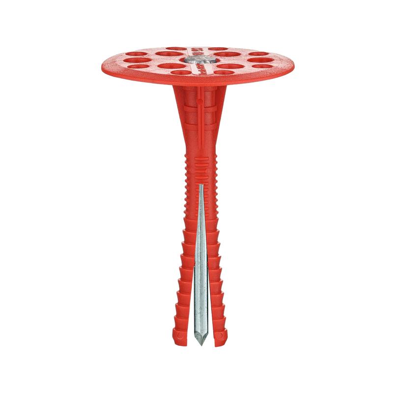 Тарельчатый дюбель IZM состоит из следующих элементов: дюбель с двухсегментной распорной зоной и увеличенной прижимной шайбой диаметром 60 мм, и распорный элемент – гвоздь. Дюбель выполнен из полипропилена, гвоздь – из углеродистой стали с антикоррозионным горячеоцинкованным покрытием. Дюбель предназначен для крепления теплоизоляционных строительных материалов и изделий (толщиной до 240 мм) к основаниям из бетона, кладки из полнотелого силикатного керамического и пустотелого керамического кирпича, ячеистого бетона. Установка производится методом сквозного монтажа. В среднем на 1 кв. м площади теплоизоляции применяется 5-6 дюбелей.