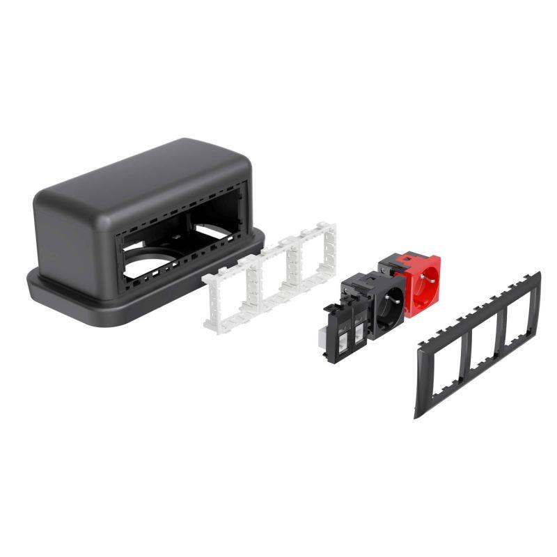 Напольная двухсторонняя башенка BUS. Назначение: организация рабочего места в открытом интерьере, под столами, трибунами и т. д. Характеристики: монтаж ЭУИ с 2 сторон, по 6 модулей; монтаж ЭУИ серий "Viva" и "45х45 мм" в соответствующих каркасах. Комплект поставки: основание ? 1 шт.; стойка ? 1 шт.; крышка ? 1 шт.; саморезы для монтажа стойки к основанию базы – 4 шт.; внутренняя центральная перегородка ? 1 шт.; рамка на 6 модулей ? 2 шт.; заглушка сплошная на 6 модулей (накладка для декора неиспользуемого проема башенки) ? 1 шт. Цвет черный