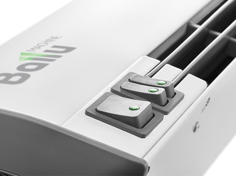 Электрическая тепловая завеса BALLU BHC-L06S03-S – компактная тепловая завеса в низкопрофильном корпусе мощностью 3 кВт и производительностью 350 м3/ч. Завеса устанавливается горизонтально над проемом при помощи монтажных отверстий, расположенных на боковых стенках декоративных крышек, и применяется для защиты дверей и окон выдачи товара шириной до 60 см. Подключение к электрической сети осуществляется при помощи кабеля с евровилкой (входит в комплект поставки). Передняя панель без перфорации блокирует распространение шума от вентиляционных колес, направляя его в потолок, а не в проходящих людей, что делает завесу значительно тише аналогов в классическом корпусе. Управление завесой осуществляется при помощи влагостойких клавиш со световой индикацией режимов работы. Клавиши находятся на корпусе завесы и позволяют использовать завесу в трех основных режимах: вентиляция без нагрева, 50% мощности и 100% мощности.