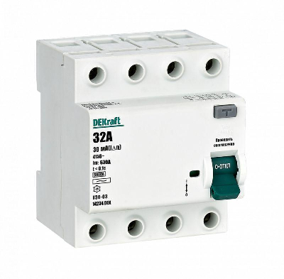 Выключатель дифференциального тока серии УЗО-03 DEKraft; 4P; номинальный ток 32 А; ном.дифф. ток 30 мА; электромеханический; тип дифференциального расцепителя - AC; на DIN-рейку. ВДТ устанавливаются в сетях напряжением до 400 В пер.тока. ВДТ применяются для защиты электроустановок от риска возникновения пожаров вследствие утечек тока. Конструкция устройств позволяет эксплуатировать их даже при низкой температуре.
