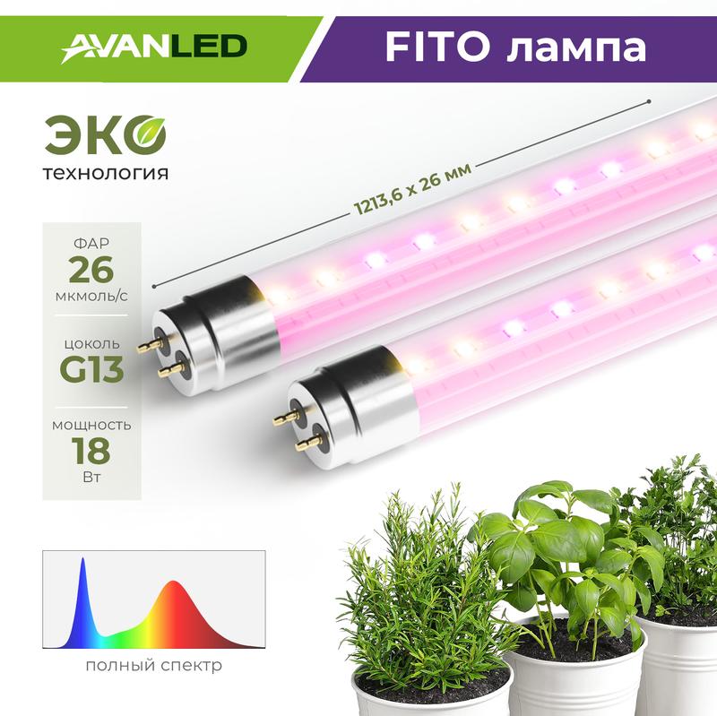 Лампа светодиодная AL T8-18-F-1200 FITO 18Вт полноспектральная G13 1200мм для растений AVANLED 12212021
