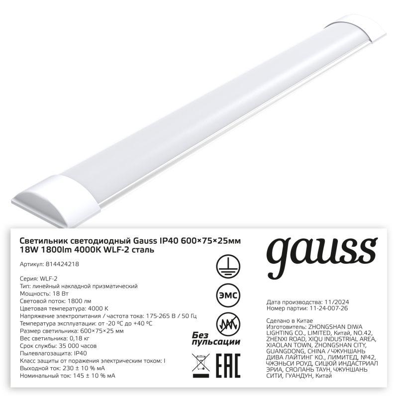 Светильник светодиодный WLF-2 18Вт 4000К IP40 1520лм 592х75х25мм ДПО линейный матов. рассеив. сталь GAUSS 844424218