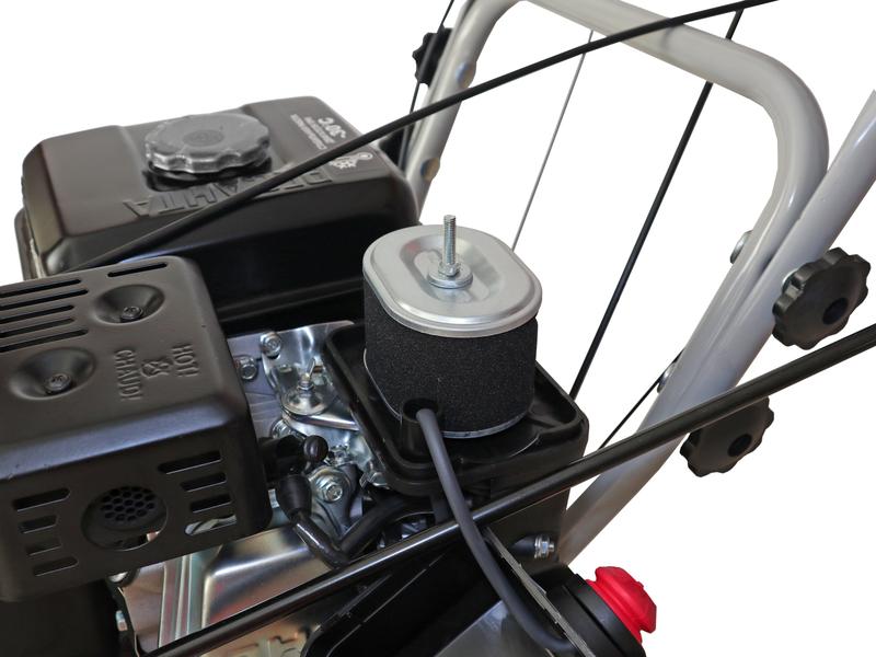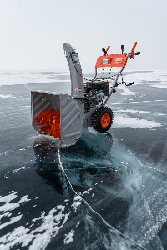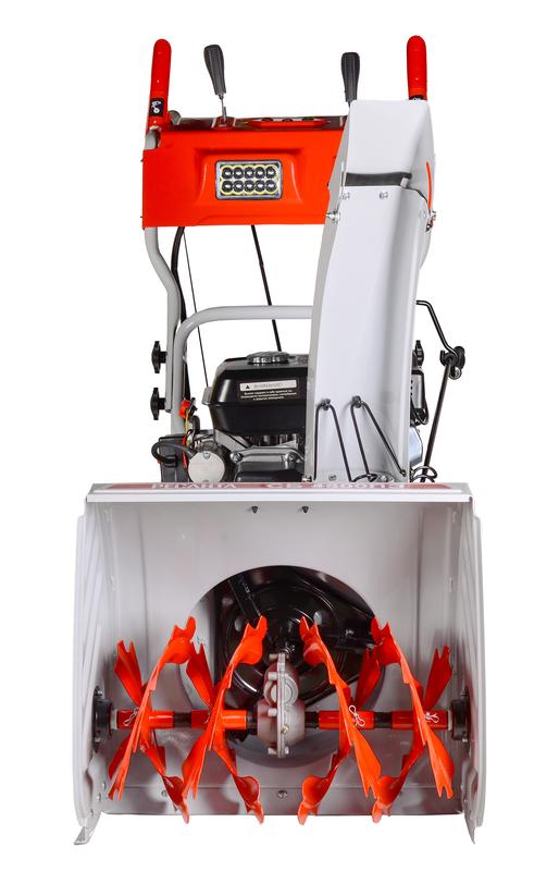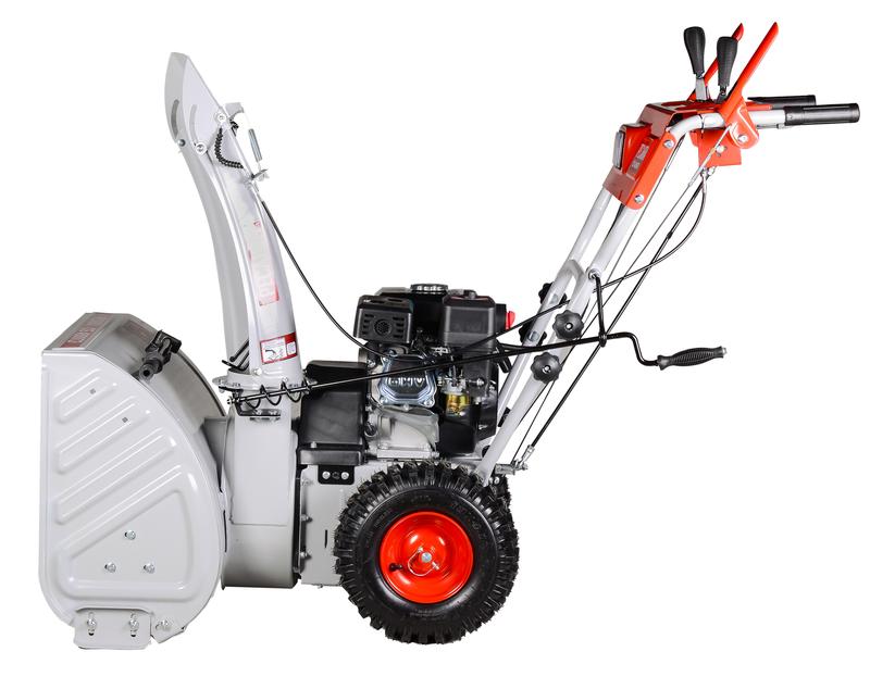 Снегоуборщик работает от 4-тактного двигателя мощностью 7 л. с. Используется воздушное охлаждение. Электростартер от сети 220 В позволяет без проблем запускать технику даже после длительного нахождения на морозе. Самоходный колесный агрегат оснащен фарой, что дает возможность расчищать территорию от снега даже в сумерках. Большие колеса с глубоким протектором обеспечивают хороший контакт с поверхностью.